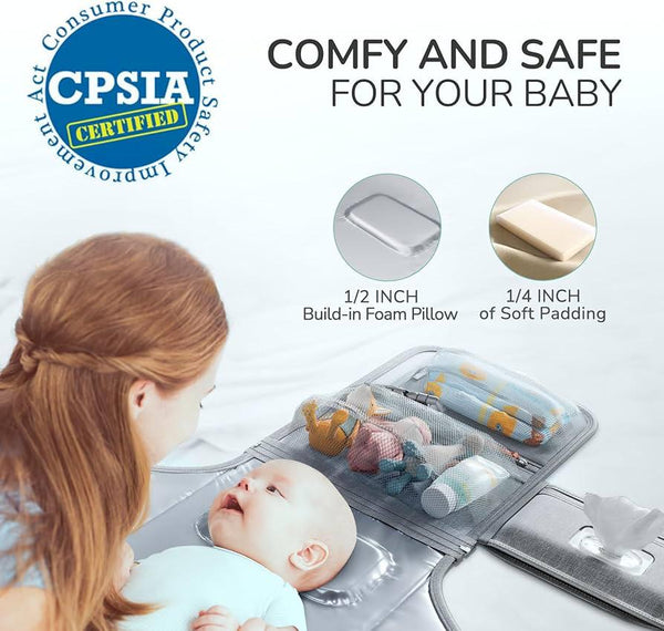 🛏️ CPSIA-certified changing pad with a built-in foam pillow and soft padding to keep your baby supported and comfortable. Safe materials and gentle cushioning make every diaper change cozy and worry-free.